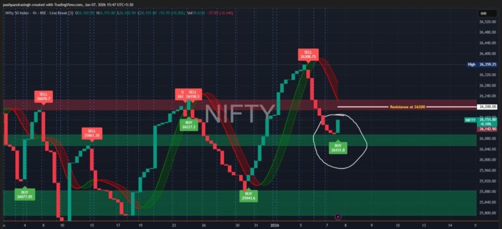 મહત્વની વાત એ છે કે PSP NURI LINe બ્રેક સૂચકે જે સ્તરે ખરીદીનો સંકેત આપ્યો છે તે મજબૂત ટેકો આપે છે, પરંતુ 26200 પર મજબૂત પ્રતિકાર પણ છે. આનો અર્થ એ છે કે આ વખતે, નિફ્ટીને કોઈપણ દિશામાં આગળ વધવા માટે ઘણા પ્રયત્નોની જરૂર પડશે.
