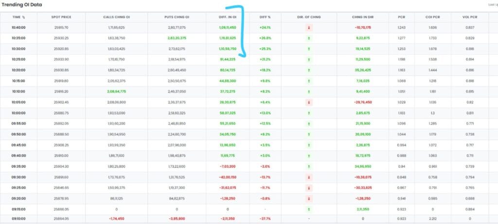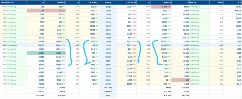વધુમાં કોઈપણ સ્તરે PE-CE Premium માં કોઈ નોંધપાત્ર ફેરફાર થયો નથી. સવારથી 1.5 કલાક પછી પણ પ્રીમિયમમાં ફક્ત 15-20 ટકા હકારાત્મક કે નકારાત્મક ફેરફાર થયો છે. આનો અર્થ એ છે કે મુખ્ય ખેલાડીઓ હાલમાં બજારમાં ઓછા એક્ટિવ છે.