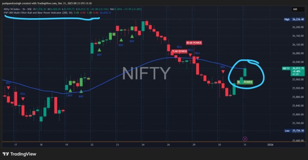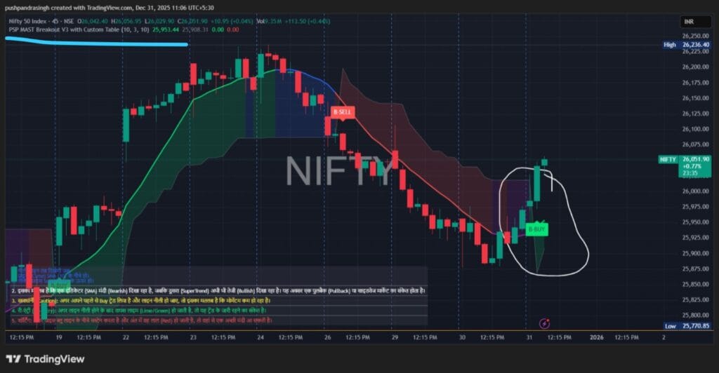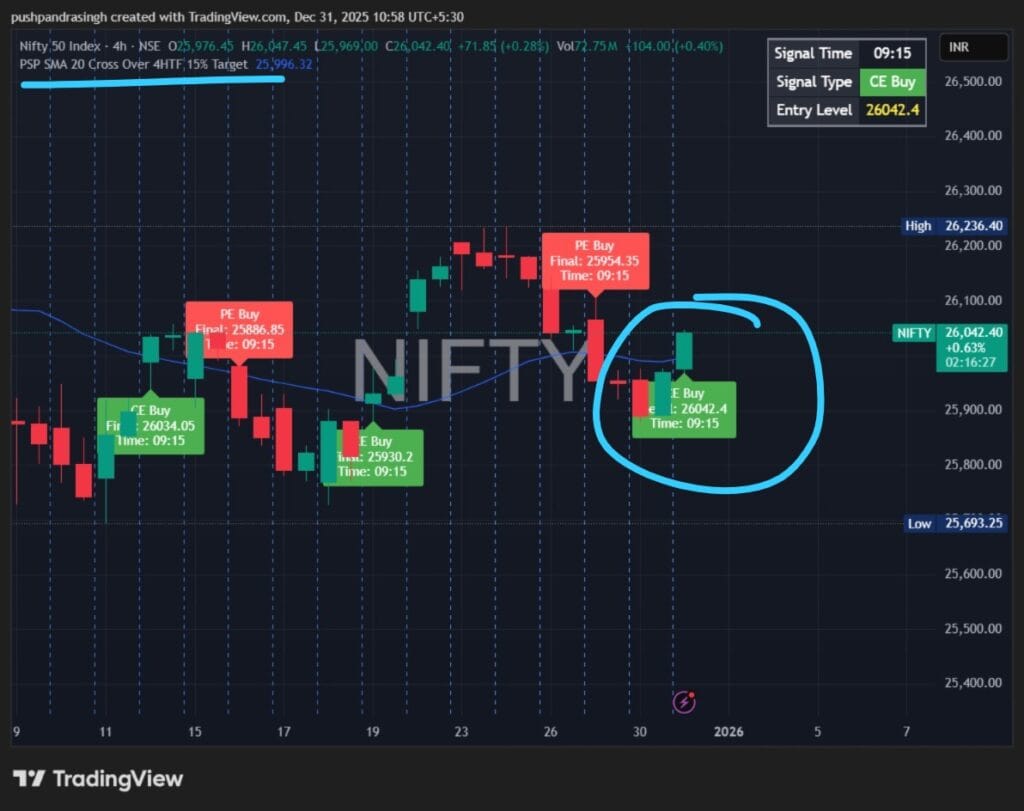PSP SMAa 20 ક્રોસ ઓવર 4HTF સૂચક પણ તેજીનો સંકેત આપે છે. 31 ડિસેમ્બર, 2025 ના રોજ સવારે 9:15 વાગ્યે ખરીદીનો સંકેત આપવામાં આવ્યો હતો, અને 4-કલાકની સમયમર્યાદા પરની કેન્ડલ 20 SMA થી ઉપર ગઈ હતી, જે એક મજબૂત ટૂંકા ગાળાનો તેજીનો સંકેત છે.