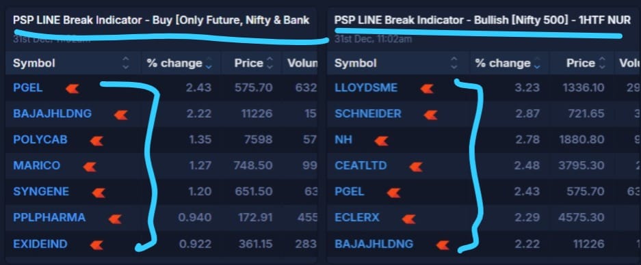 આ બધા એવા શેર છે જેમને 1 કલાકની સમયમર્યાદામાં ખરીદીનો સંકેત મળ્યો છે, જેમ કે PSP લાઈન બ્રેક સૂચક દ્વારા જોવા મળે છે. આમાં નિફ્ટી 500 અને નિફ્ટી ફ્યુચર્સમાં ઉચ્ચ-ગુણવત્તાવાળા શેરોનો સમાવેશ થાય છે.