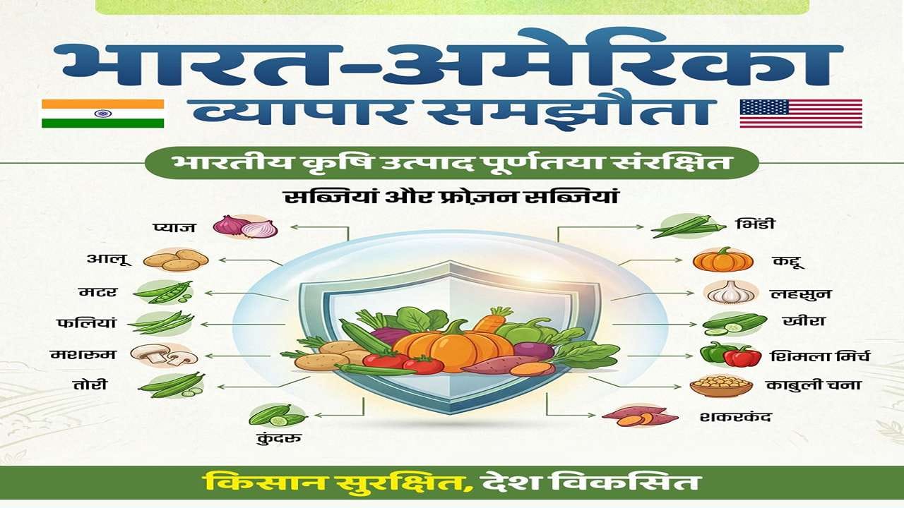 ટુકમાં ભારતે અમેરિકા સાથે કરેલ ટ્રેડ ડીલમાં ભારતીય ખેતી, ખેડૂત અને ખેતપેદાશને રક્ષણ આપવા માટે કેટલાક પગલાં લેવાયા છે. જે અનુસાર ફ્રોજન શાકભાજી, શાકભાજી, ડબ્બામાં પેક કરેલ શાકભાજી,મરી મસાલા, ડેરી પ્રોડક્ટ વગેરેની આયાત નહીં થઈ શકે.