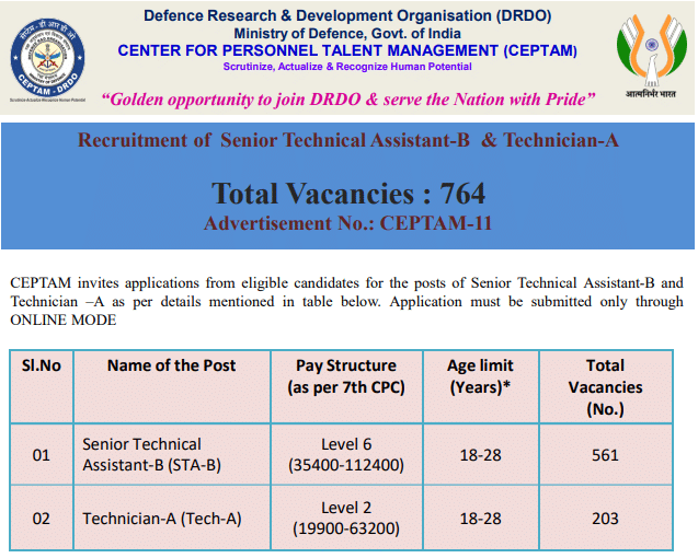 આ CEPTAM 11 ભરતી ઝુંબેશ દ્વારા, DRDO સેન્ટર ફોર પર્સનલ ટેલેન્ટ મેનેજમેન્ટ ખાતે કુલ 764 સિનિયર ટેકનિકલ આસિસ્ટન્ટ B અને ટેકનિશિયન A પદો માટે ઉમેદવારોની પસંદગી કરશે. DRDO સાથે કારકિર્દી બનાવવા માંગતા ઉમેદવારોએ આ તક ગુમાવવી જોઈએ નહીં.