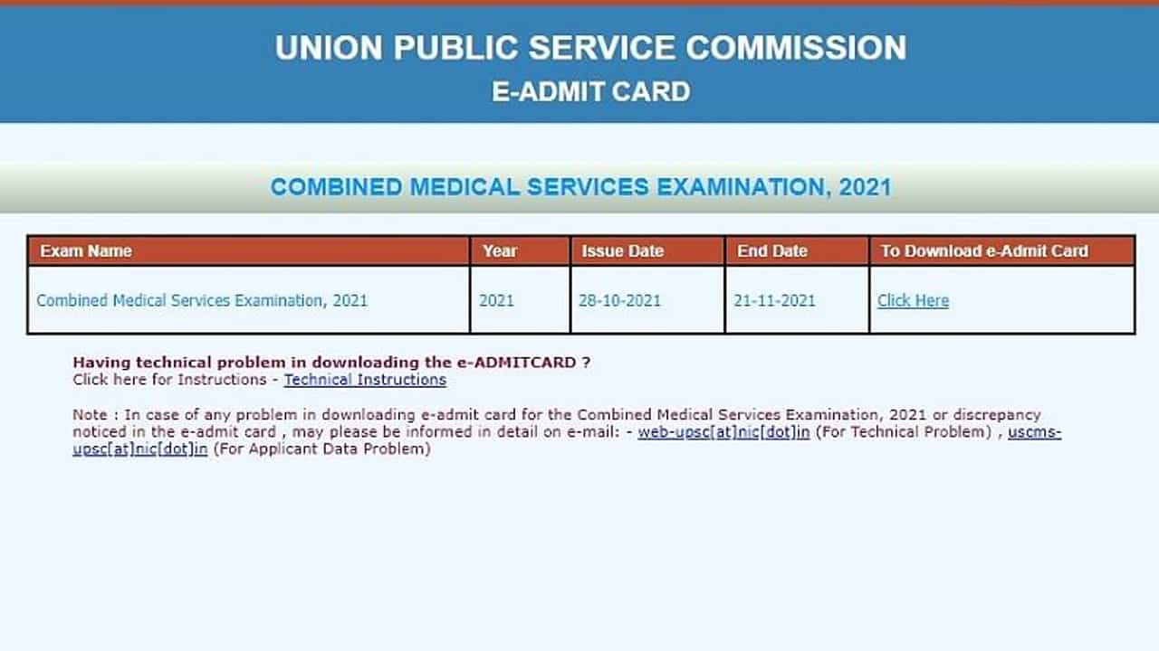 UPSC CMS Admit Card 2021: યુનિયન પબ્લિક સર્વિસ કમિશન દ્વારા સંયુક્ત તબીબી સેવા પરીક્ષા (Combined Medical Services Examination) માટેનું પ્રવેશ કાર્ડ અપલોડ કરવામાં આવ્યું છે. આ સ્થિતિમાં જે ઉમેદવારોએ આ પરીક્ષા માટે અરજી કરી હતી તેઓ સત્તાવાર વેબસાઇટ upsconline.nic.in પર જઈને એડમિટ કાર્ડ ડાઉનલોડ કરી શકે છે.