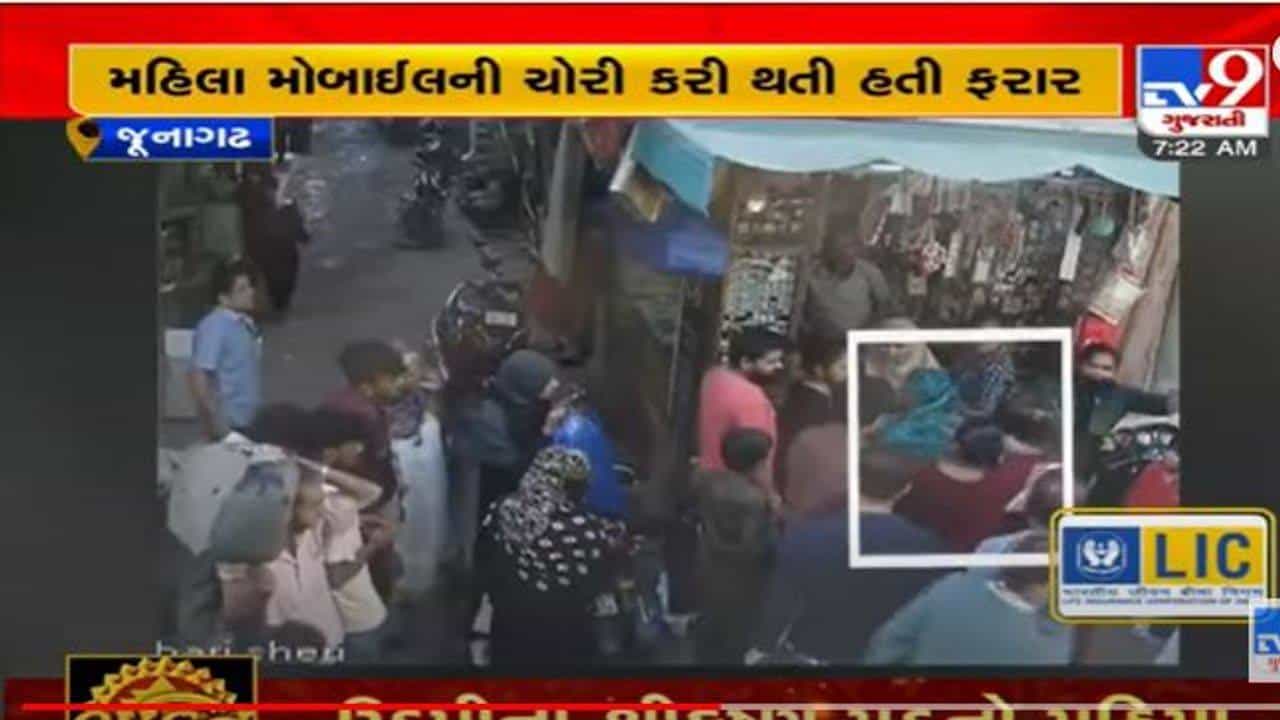 જુનાગઢ (Junagadh)ના માંગનાથ વિસ્તારમાં ભર બજારમાં એક મહિલાને ચોરી (Thet) કરતા અન્ય મહિલાઓએ પકડી લીધી હતી. મહિલા મોબાઇલની ચોરી (Women Mobile Thief) કરીને ફરાર થઇ રહી હતી. તે દરમિયાન જ અન્ય મહિલાઓ તેને જોઇ ગઇ અને જાહેરમાં જ તેને મેથીપાક ચખાડ્યો હતો. આ સમગ્ર ઘટના CCTV કેમેરામાં કેદ થઇ ગઇ છે.
