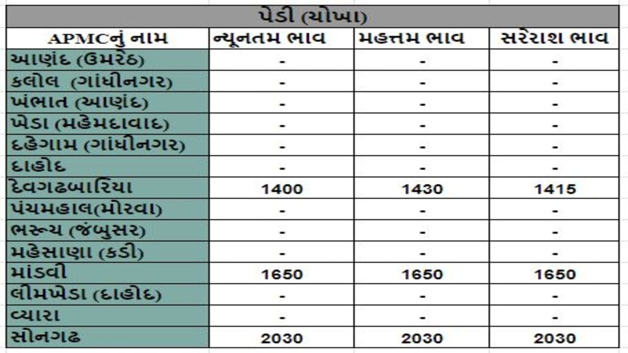 પેડી (ચોખા)ના તા.02-10-2023ના રોજ APMCના ભાવ રૂ.1400 થી 2030 રહ્યા.
