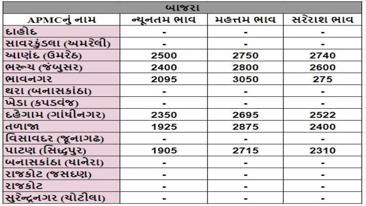 બાજરાના તા.06-04-2023ના રોજ APMCના ભાવ રૂ.1905 થી 3050 રહ્યા.