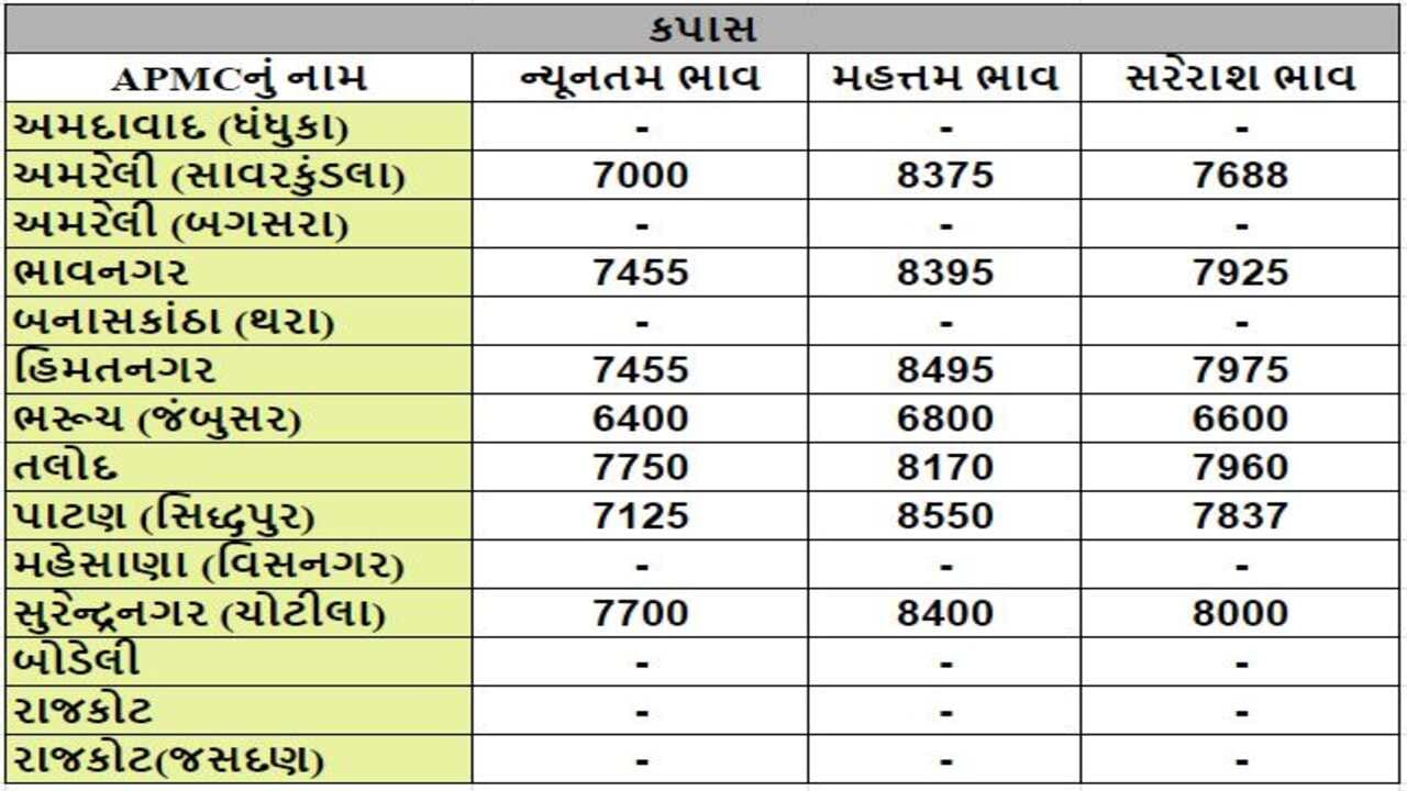 કપાસના તા.06-04-2023ના રોજ APMCના ભાવ રૂ.6400 થી 8550 રહ્યા.
