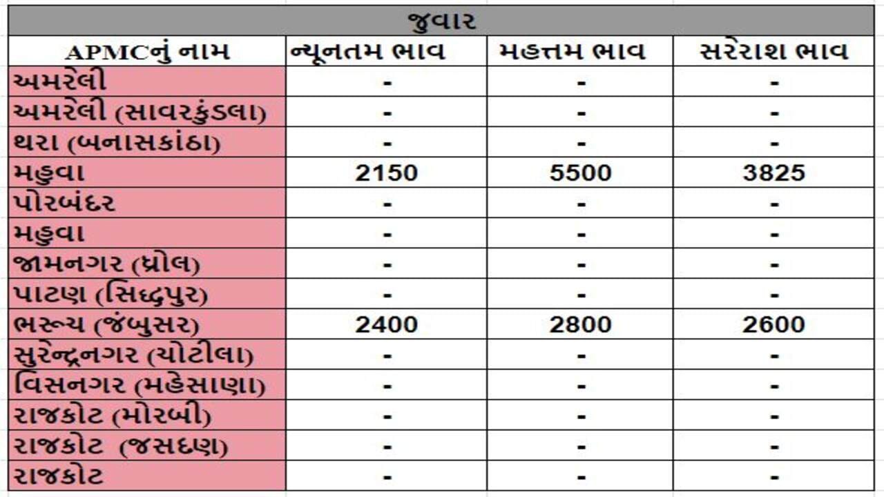 Mandi : મહુવાની APMCમાં જુવારના મહત્તમ ભાવ રૂપિયા 5500 રહ્યા, જાણો જુદા-જુદા પાકના ભાવ. ગુજરાતના વિવિધ APMC માં અનાજના શુ રહ્યા ભાવ ( Prices ) તે અંગે, ખેડૂત મિત્રો માટે ગુજરાતના પાકોના APMC ના ભાવ ( Prices ) વિશેની માહિતી દરરોજ અમે તમને આપીશું.