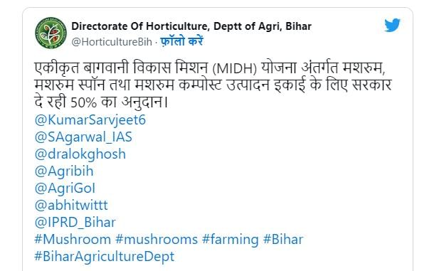 અત્યારે બિહાર સરકાર મશરૂમ પર ધ્યાન આપી રહી છે. રાજ્ય સરકાર માને છે કે મશરૂમની ખેતી દ્વારા રાજ્યના નાના અને સીમાંત ખેડૂતોની આવક વધારી શકાય છે. મશરૂમ એ બાગાયતી પાક છે. તેની ખેતીમાં ઘણો ઓછો ખર્ચ થાય છે. તેની ખેતી માટે ખેતર અને સિંચાઈની જરૂર નથી. ખેડૂતો ઘરની અંદર પણ મશરૂમ ઉગાડી શકે છે. રાજ્યમાં હજારો ખેડૂતો ઘરની અંદર મશરૂમ ઉગાડી રહ્યા છે. તે આમાંથી સારી કમાણી કરી રહ્યા છે. આવા મશરૂમ રીંગણ, કોબીજ અને કારેલા સહિત અન્ય શાકભાજી કરતાં મોંઘા વેચાય છે. આવી સ્થિતિમાં ઓછી મહેનતે મશરૂમની ખેતી કરવાથી ખેડૂતોને વધુ ફાયદો થશે.