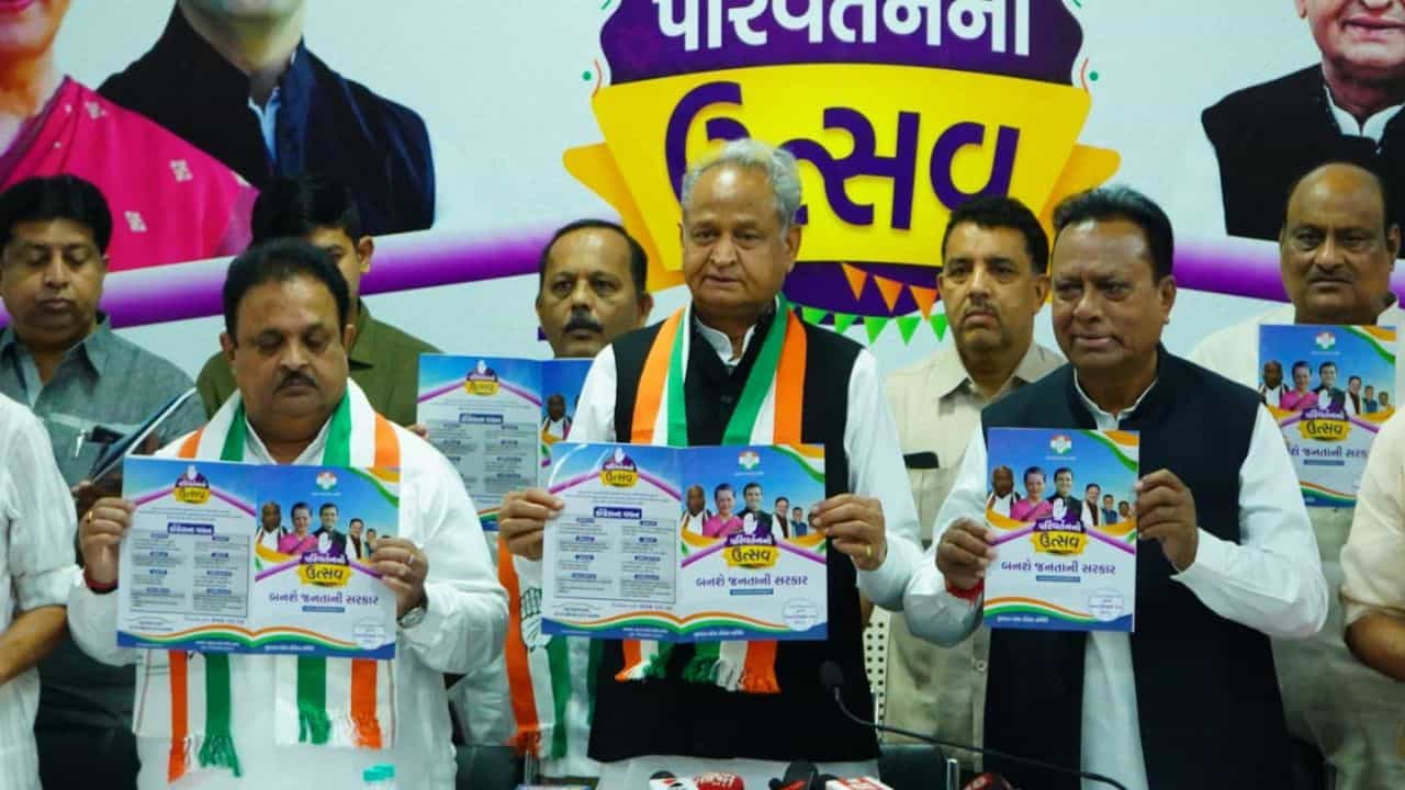 ગુજરાત એસેમ્બલી ઇલેકશન 2022 :ગુજરાત કોંગ્રેસ દ્વારા ચૂંટણી ઢંઢેરો જાહેર કરવામાં આવ્યો છે. જેમાં કુલ આઠ મુદ્દાઓને કેન્દ્ર સ્થાને રાખવામાં આવ્યા છે. મતદારોને રીઝવવા માટે કોંગ્રેસ કેટલાક વાયદાઓ આપ્યા છે. ‘જનઘોષણા પત્ર 2022 બનશે જનતાની સરકાર’ નામથી મેનિફેસ્ટોની જાહેરાત કરવામાં આવી છે. તો સાથે જ આ કોંગ્રેસના ચૂંટણી ઢંઢેરામાં રાહુલ ગાંધીના 8 વચન કેન્દ્ર સ્થાને રાખવામાં આવ્યા છે. ખેડૂતોનું દેવું માફ, 500 રૂપિયામાં ગેસ સિલિન્ડર, 300 યુનિટ વીજળી ફ્રી,જૂની પેંશન યોજના, કોન્ટ્રાકટ પ્રથા નાબૂદી સહિતના તમામ વાયદાઓને તેમાં આવરી લેવામાં આવ્યા છે. ગુજરાત કોંગ્રેસનું ‘જન ઘોષણાપત્ર’ રાજસ્થાનનાં મુખ્યમંત્રી અશોક ગેહલોતના હસ્તે જાહેર કરવામાં આવ્યું છે.
