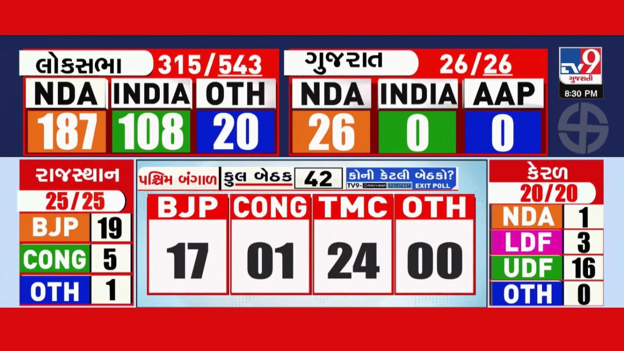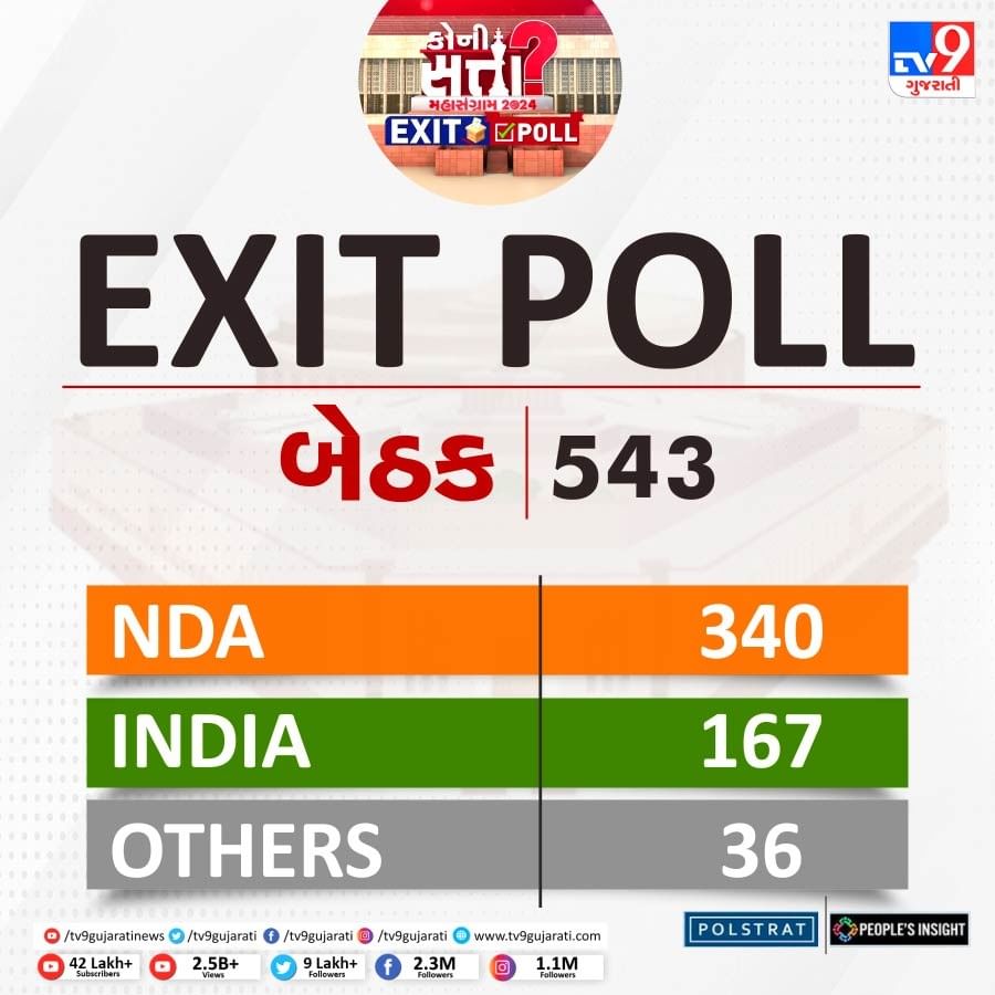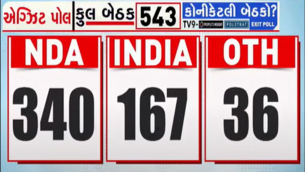 4 જૂને મત ગણતરી પહેલા, POLSTRAT અને PEOPLE’s INSIGHT અને TV9 નેટવર્ક એ એક્ઝિટ પોલ સર્વે હાથ ધર્યો છે. 4 મેના પરિણામો પહેલાં, TV9 ભારતવર્ષ તમને પીપલ્સ ઈનસાઈટ, પોલસ્ટ્રેટ અને ટીવી9ના સહયોગથી બનાવેલ સૌથી વિશ્વસનીય એક્ઝિટ પોલ બતાવી રહ્યું છે. આ એક્ઝિટ પોલના દરેક ડેટાની ખાતરી આપવામાં આવે છે. TV9-પીપલ્સ ઈનસાઈટ, પોલ્સ્ટ્રેટના સર્વેમાં આશરે 1 કરોડ લોકોનું સેમ્પલ સાઈઝ છે. જેમાં IVR દ્વારા લોકોના અભિપ્રાય લેવામાં આવ્યા હતા અને રેન્ડમ નંબર જનરેટર દ્વારા કોલ કરવામાં આવ્યા હતા. અમે દેશની તમામ 543 લોકસભા સીટો પર સર્વે કર્યો છે.