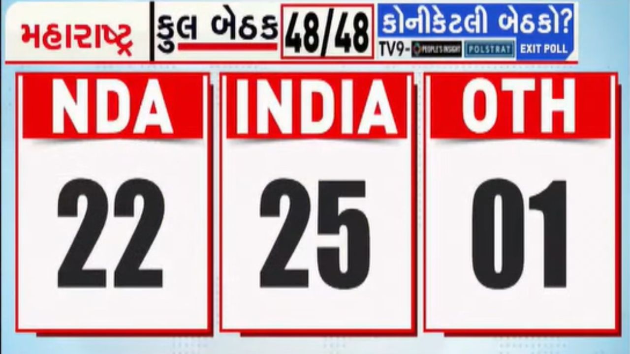 મહારાષ્ટ્રની કુલ 48 બેઠક માંથી ભાજપને 18 બેઠકો અને ભાજપ ગઠબંધન એનડીએને 22 બેઠકો મળવાની સંભાવના છે. એક્ઝિટ પોલના આંકડા કોગ્રેસને 5 અને કોગ્રેસ સહિતની i.n.d.i.a alliance party ને 25 સીટ મળે તેવી સંભાવના છે.આ ઉપરાંત અન્યને એક સીટ મળે તેવી સંભાવના છે. આમ ટોટલ 48 બેઠક માંથી NDA ગઠબંધન 22 અને i.n.d.i.a alliance ગઠબંધન 25 સીટ મળે તેવી સંભાવના છે.