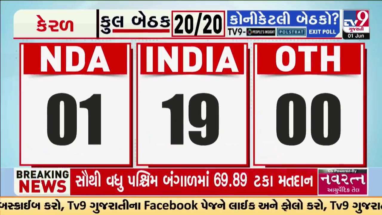 કેરળમાં લોકસભાની કુલ 20 બેઠકો છે. TV9 નેટવર્ક, POLSTRAT અને પીપલ્સ ઈનસાઈટના એક્ઝિટ પોલમાં કોંગ્રેસની આગેવાની હેઠળનું UDF ગઠબંધન ફરી એકવાર અહીં જીતતું જોવા મળે છે. તેને 16 બેઠકો મળવાની ધારણા છે. આ વખતે એનડીએનું ખાતું એક સીટ સાથે ખુલતું જોવા મળી રહ્યું છે. જ્યારે ત્રીજા ગઠબંધન એલડીએફને 3 બેઠકો મળી શકે છે.