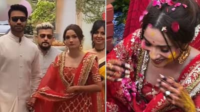 આમાંથી એક વીડિયોમાં તમે અંકિતા લોખંડેને બ્રાઈટ રેડ કલરનો સલવાર કમીઝ પહેરેલી જોઈ શકો છો. અંકિતા તેના બોયફ્રેન્ડ વિકીનો હાથ પકડીને હલ્દી સેરેમનીના સ્થળે આવતી જોવા મળે છે. તે જ સમયે, તમે વિકી જૈનને ઑફ-વ્હાઇટ શેરવાની અને ધોતી પહેરેલા જોઈ શકો છો. તેણે બ્લેક સનગ્લાસ સાથે તેના લુકને મેચ કર્યો છે.