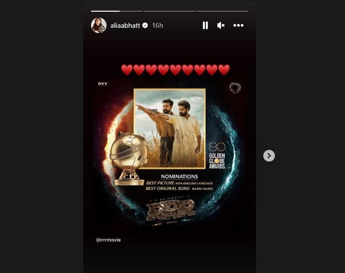 ગોલ્ડન ગ્લોબ એવોર્ડ માટે નોમિનેશન મળ્યા બાદ ફિલ્મના ડિરેક્ટર સિવાય તમામ કલાકારો ખૂબ જ ખુશ છે. આ ફિલ્મમાં બોલિવૂડ એક્ટ્રેસ આલિયા ભટ્ટ પણ જોવા મળી હતી. તેનો રોલ બહુ મોટો નહોતો પરંતુ તેણે પોતાના પાત્રથી બધાના દિલ જીતી લીધા હતા. આલિયા ભટ્ટ પણ ગોલ્ડન ગ્લોબ એવોર્ડ માટે નોમિનેટ થવાથી ખુશ છે. ઇન્સ્ટાગ્રામ સ્ટોરીમાં નોમિનેશનના સમાચાર શેર કરતા તેણે ઘણા હાર્ટ ઇમોજી શેર કર્યા છે.