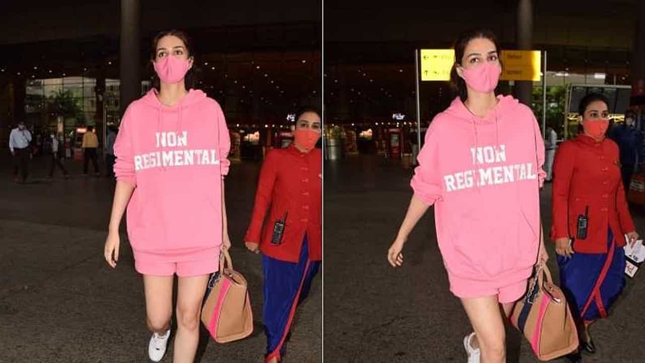 ક્રિતી સેનન આ દરમિયાન પિંક કલરનું હુડી ટી-શર્ટ પહેર્યું હતું, અભિનેત્રી સિમ્પલ લુકમાં પણ કહેર મચાવતી જોવા મળી છે.