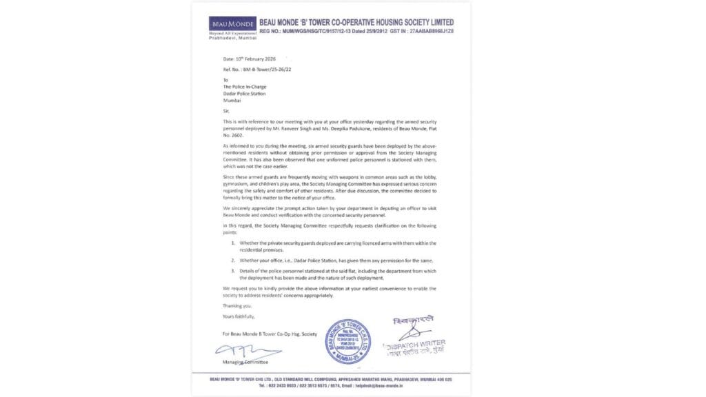 રણવીર સિંહ અને દીપિકા પાદુકોણ રહે છે તે સોસાયટીના રહેવાસીઓએ પણ ચિંતા વ્યક્ત કરી છે. વધેલી સુરક્ષા કારણે રોજિંદા જીવન પર અસર પડી રહી હોવાની વાત સામે આવી છે. સોસાયટી વહીવટીતંત્રે આ મુદ્દે પોલીસને લેખિતમાં પોતાની વાત રજૂ કરી છે.
