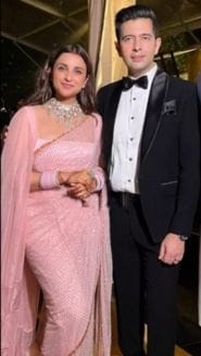 પરિણીતી ચાપરા અને રાઘવ ચઢ્ઢાના લગ્ન ઉદયપુરના લીલા પેલેસમાં થયા હતા. લગ્ન પહેલાના રિસેપ્શનની તસવીરો સામે આવી રહી છે. ફોટામાં બંને ખૂબ જ સુંદર લાગી રહ્યા છે. ફોટામાં પરિણીતી ચોપરા ગુલાબી સાડીમાં જોવા મળી રહી છે. તેણે ડાયમંડ નેકલેસ સાથે તેના દેખાવને સુંદર બનાવ્યો છે. રાઘવની વાત કરીએ તો તે બ્લેક આઉટફિટમાં હેન્ડસમ લાગી રહ્યો છે.