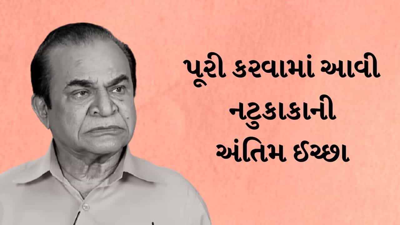 તારક મહેતામાં નટુકાકાનું પાત્ર ભજવીને ઘેર-ઘેર લોકપ્રિય થનારા ઘનશ્યામ નાયકનું ત્રીજી ઓક્ટોબરના રોજ 77 વર્ષની ઉંમરે અવસાન થયું હતું. નટુકાકાના આજે સવારે અંતિમ સંસ્કાર કરવામાં આવ્યા હતા. ઘનશ્યામ નાયક પંચમહાભૂતમાં વિલીન થયા અને પરિવારે રડતી આંખે અંતિમ વિદાય આપી હતી. આ અંતિમ વિદાયમાં નટુકાકાની છેલ્લી ઈચ્છા પૂર્ણ કરવામાં આવી.