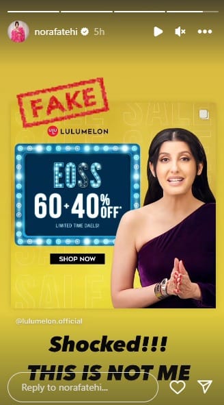 ‘લુલુલેમોન’ નામની એક ફેશન બ્રાન્ડ છે, જેને નોરા ફતેહી વીડિયોમાં પ્રમોટ કરતી જોવા મળે છે. નોરા ફતેહીની તસવીર આ વીડિયોમાં છે. સાથે જ 60-40 ટકા ડિસ્કાઉન્ટ પણ આપવામાં આવી રહ્યું છે. જો કે, હવે અભિનેત્રીએ તેના સત્તાવાર ઇન્સ્ટાગ્રામ હેન્ડલ પર એક સ્ટોરી શેર કરી છે. વીડિયો શેર કરતી વખતે નોરા ફતેહીએ તેને ફેક ગણાવ્યો છે.