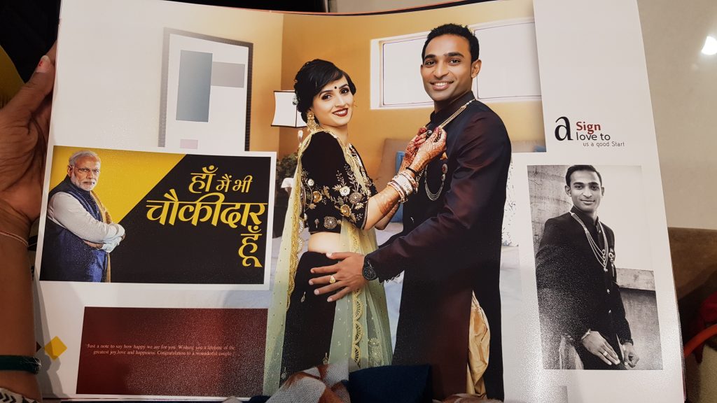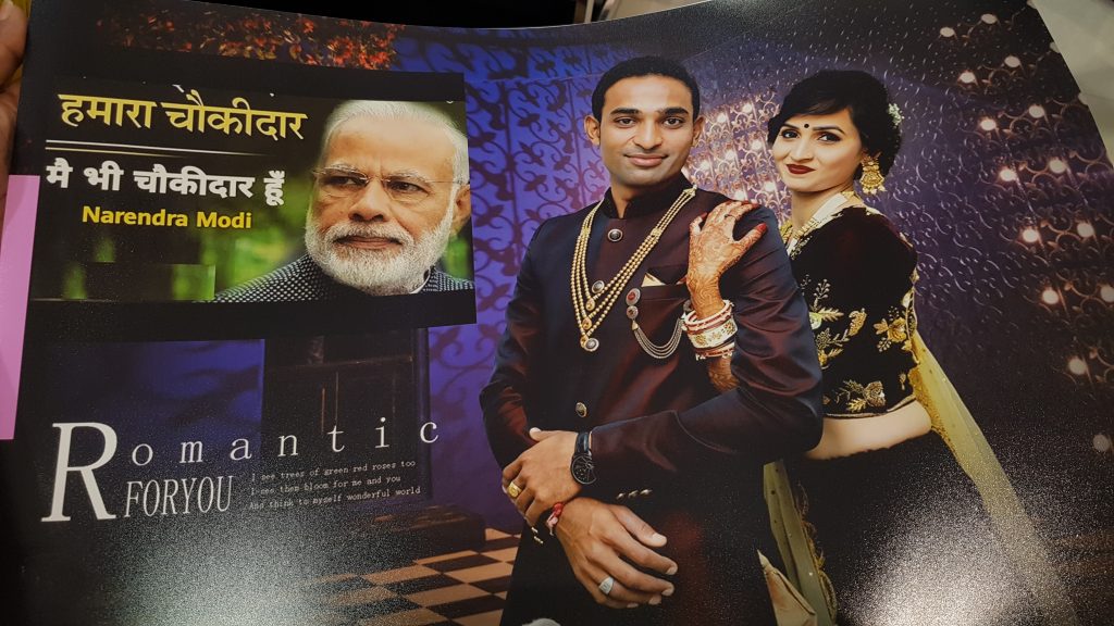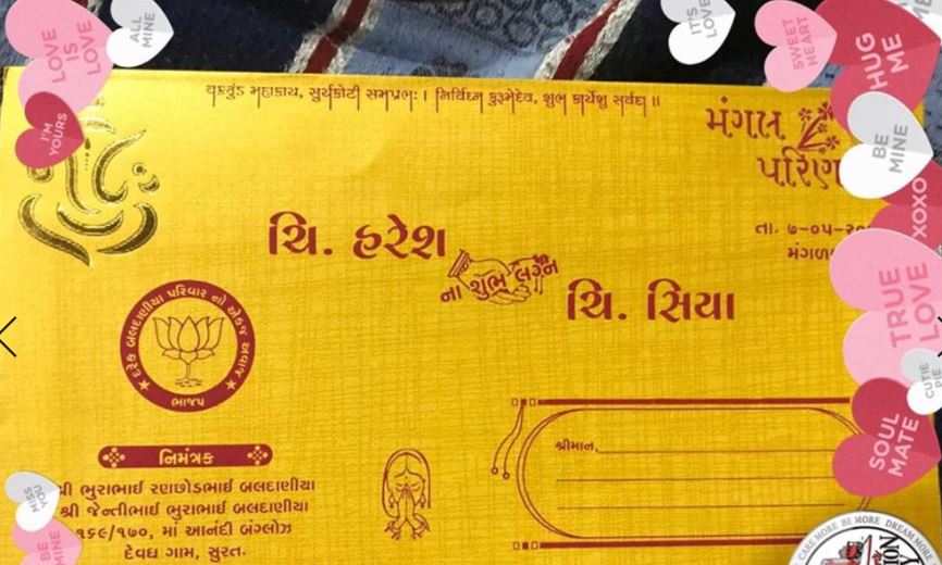 આ બંનેએ પોતાના લગ્ન માટે જે કંકોત્રી છપાવી છે તેના પર ભાજપનું ચિન્હ દોરીને તેમને વડાપ્રધાન મોદીને જ ફરી વડાપ્રધાન બનાવવા માટેની અપીલ કરી છે. પ્રભુતામાં પગલાં માંડવા જઈ રહેલા હરેશ અને સિયાને વડાપ્રધાન મોદી એટલા પ્રિય છે કે એમણે લગ્ન પહેલા કરાવેલા પ્રિ-વેડિંગ ફોટોશૂટમાં પણ વડાપ્રધાન નરેન્દ્ર મોદીનો ફોટો છપાવ્યો છે. અલગ અલગ ડ્રેસ સાથે પડાવેલા તેમના કપલ્સ ફોટોમાં તેઓએ વડાપ્રધાન મોદીનો ફોટો પણ ‘મેં ભી ચોકીદાર’ના સૂત્ર સાથે છપાવ્યો છે.