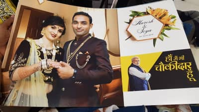 આ બંનેએ પોતાના લગ્ન માટે જે કંકોત્રી છપાવી છે તેના પર ભાજપનું ચિન્હ દોરીને તેમને વડાપ્રધાન મોદીને જ ફરી વડાપ્રધાન બનાવવા માટેની અપીલ કરી છે. પ્રભુતામાં પગલાં માંડવા જઈ રહેલા હરેશ અને સિયાને વડાપ્રધાન મોદી એટલા પ્રિય છે કે એમણે લગ્ન પહેલા કરાવેલા પ્રિ-વેડિંગ ફોટોશૂટમાં પણ વડાપ્રધાન નરેન્દ્ર મોદીનો ફોટો છપાવ્યો છે. અલગ અલગ ડ્રેસ સાથે પડાવેલા તેમના કપલ્સ ફોટોમાં તેઓએ વડાપ્રધાન મોદીનો ફોટો પણ ‘મેં ભી ચોકીદાર’ના સૂત્ર સાથે છપાવ્યો છે.