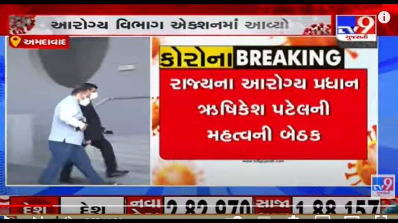 અમદાવાદમાં કોરોના બેકાબુ થતાં તંત્ર એક્શનમાં આવી ગયું છે. રાજ્યમાં સૌથી વધુ કેસ અમદાવાદમાં આવી રહ્યા છે તેથી રાજ્ય આરોગ્ય મંત્રી (Health Minister) ઋષિકેશ પટેલે અમદાવાદના અધિકારીઓ સાથે બેઠક કરી છે. આ બેઠકમાં ટાસ્ક ફોર્સના તબીબો, AMC કમિશનર, કલેક્ક્ટર અને અધિકારીઓ જોડાયા હતા. અમદાવાદ રિવરફ્રન્ટ ખાતેના વલ્લભ સદન ખાતે આ બેઠક યોજાઈ હતી.