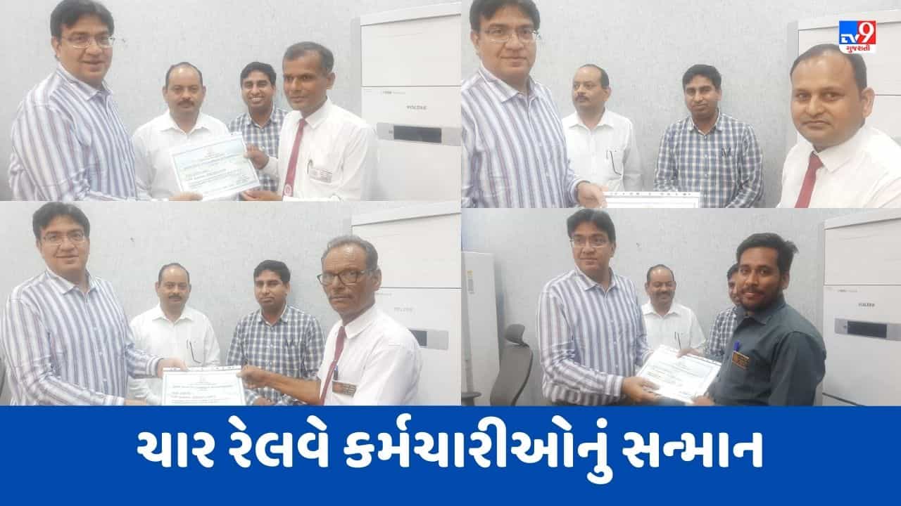 Ahmedabad : રેલવે સંરક્ષાના ક્ષેત્રમાં (Railway Protection sector) નોંધપાત્ર કામગીરી કરનાર ચાર રેલવે કર્મચારીઓનું (Railway employees) ડિવિઝનલ રેલવે મેનેજર સુધીર કુમાર શર્મા દ્વારા સન્માન (honour) કરવામાં આવ્યું છે. આ ચાર કર્મચારીઓને પ્રમાણપત્રો અને મેડલ આપીને સન્માનિત કરવામાં આવ્યા છે. સંરક્ષા મેડલ અને પ્રમાણપત્રથી સન્માનિત રેલવે કર્મચારીઓમાં ગાંધીધામના રામકૃષ્ણ યાદવ કાંટેવાલા, ખાખરેચીના સ્ટેશન માસ્ટર બલવીરસિંહ , ઊંઝાના સ્ટેશન માસ્ટર સંદીપ સિંહ અને સ્ટેશન માસ્ટર ઈમ્તિયાઝ અહેમદ કામલીને ડીઆરએમ તરફથી સન્માન આપવામાં આવ્યુ.