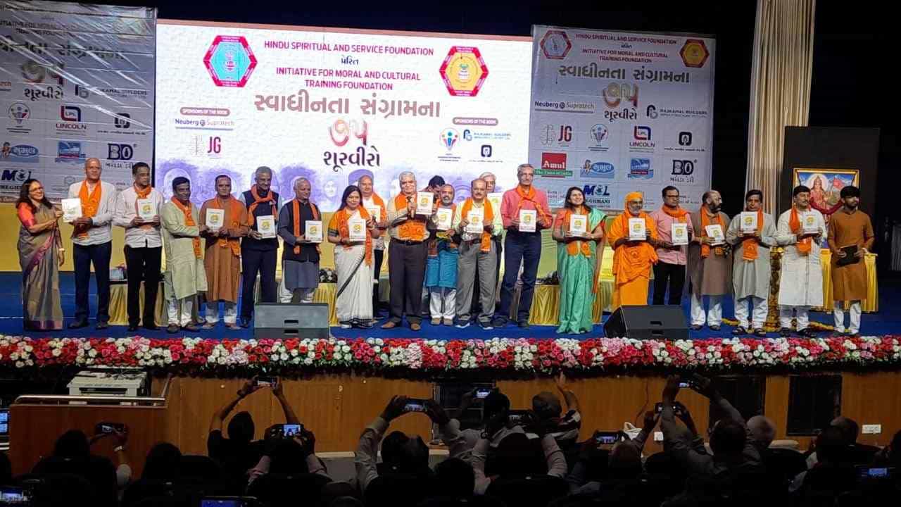 અમદાવાદમાં આઝાદી કા અમૃત મહોત્સવની ઉજવણીના (Azadi Ka Amrut Mahotsav) ભાગરૂપે શનિવારે હિન્દુ આધ્યાત્મિક અને સેવા ફાઉન્ડેશન (એચએસએસએફ) અને ઇનિશિયેટિવ ફોર મોરલ એન્ડ કલ્ચરલ ટ્રેનિંગ ફાઉન્ડેશન (આઇએમસીટીએફ) દ્વારા 75 સ્વાતંત્ર્ય સેનાનીઓના (Freedom Fighter) શૌર્યની ઉજવણી કરતા પુસ્તકનું વિમોચન(Book Launch) કરવામાં આવ્યું હતું. સ્વાધીનતા સંગ્રામના 75 શૂરવીરો શીર્ષક ધરાવતું આ પુસ્તક 75 સ્વાતંત્ર્ય સેનાનીઓની વીરતાની ઉજવણી કરે છે. અને દેશ માટે તેમના દ્વારા આપવામાં આવેલા બલિદાન ની કથાને રજૂ કરે છે.