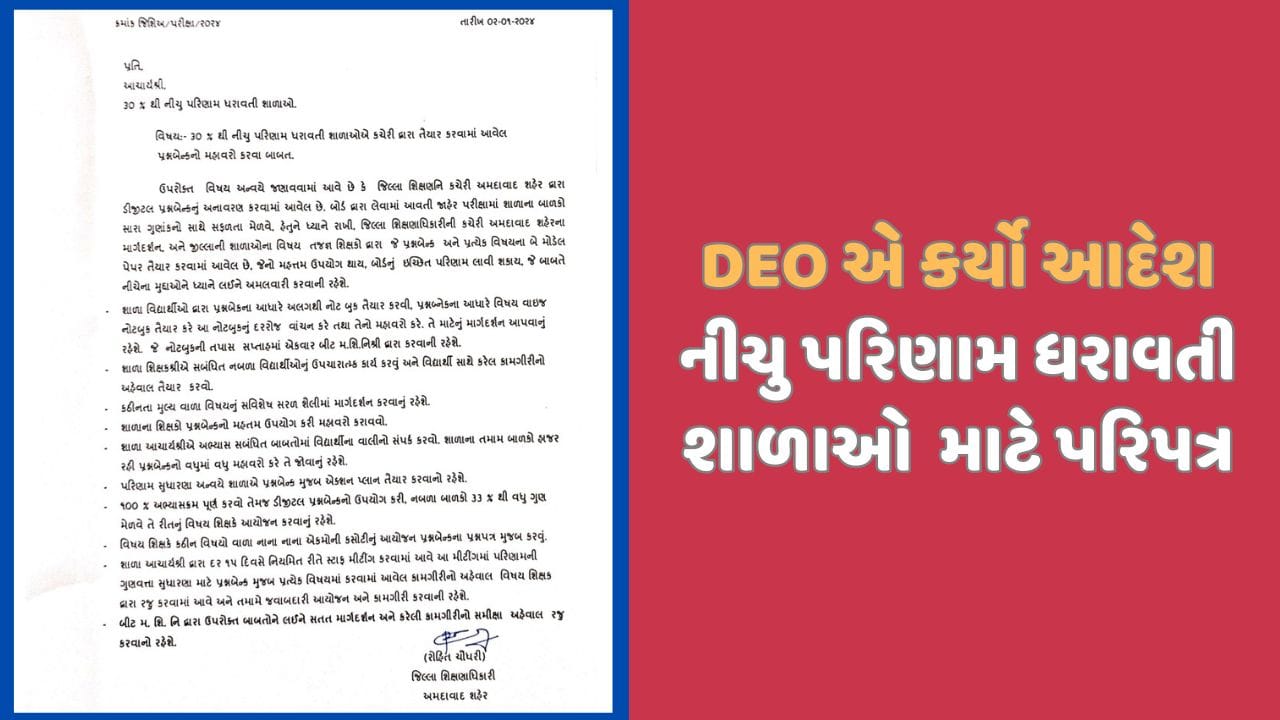 અમદાવાદ શહેર વિસ્તારમાં આવેલ 600 પૈકી 66 શાળાઓ એવી છે કે જેનું 2023 બોર્ડ પરીક્ષામાં પરિણામ 30 ટકા કરતા ઓછું આવ્યું હતું. ઓછા પરિણામ વાળી શાળાઓના પરિણામમાં સુધારો આવે એવા પ્રયત્નો સમગ્ર રાજ્યમાં થઈ રહ્યા છે. ત્યારે અમદાવાદ શહેર DEO એ તો પરિપત્ર કરી દીધો છે.