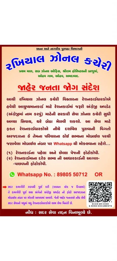 Ahmedabad: આયુષ્યમાન કાર્ડ લેવા માટે હવે રાશનકાર્ડ ધારકોએ રાશનકાર્ડ ગુજરાતીમાંથી અંગ્રેજી કરાવવા માટે રખિયાલ ઝોનલ કચેરીના ધક્કા નહીં ખાવા પડે. અરજદારો ઘરે બેઠા જ તેમનું રાશનકાર્ડ અંગ્રેજી ભાષામાં પરિવર્તિત કરી શકશે. જેના માટે રખિયાલ ઝોનલ કચેરી દ્વારા ખાસ વોટ્સએપ નંબર જાહેર કરાયો છે.