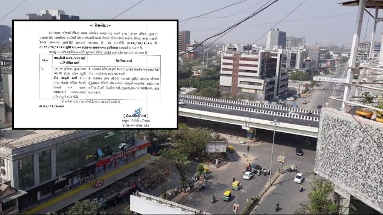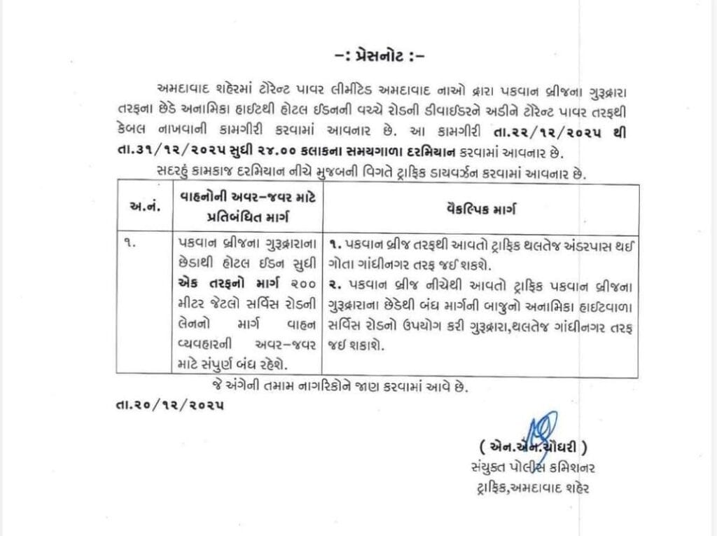 અમદાવાદમાં હાલ કર્ણાવતી ક્લબથી નવા બ્રિજની કામગીરી ચાલી રહી હોવાથી એસજી હાઈવે પર ટ્રાફિકની ભારે સમસ્યા રહે છે. ત્યારે એસજી હાઈવે પર પકવાન બ્રિજથી ગુરુદ્વારા તરફના છેડે ખાનગી વીજ કંપનીના ખોદકામને કારણે ડાવર્ઝન આપવામાં આવ્યુ છે. આ ડાયવર્ઝનને કારણે પકવાન ક્રોસ રોડથી ઈડન હોટલ સુધીનો એક તરફનો સર્વિસ રોડ આજથી (22 ડિસ.) થી 31 ડિસેમ્બર સુધી બંધ રહેશે.