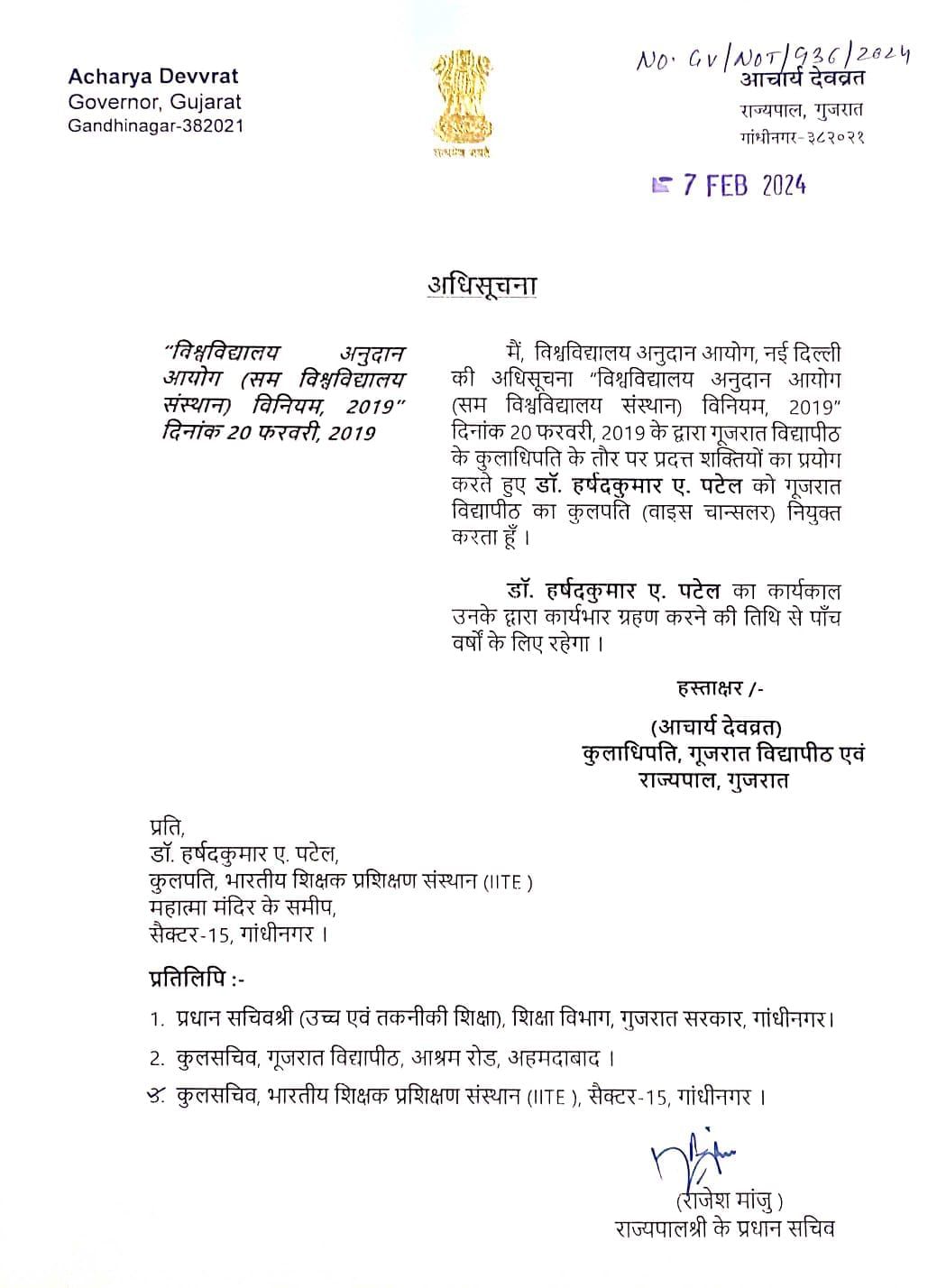 ગુજરાતના રાજ્યપાલ અને ગુજરાત વિદ્યાપીઠના કુલાધિપતિ આચાર્ય દેવવ્રતે ગુજરાત વિદ્યાપીઠના કુલપતિ તરીકે ડૉ. હર્ષદ એ પટેલની 17મા કુલપતિ તરીકે પાંચ વર્ષની મુદત માટે નિમણૂક કરી છે. ડૉ. હર્ષદ પટેલનું છેલ્લા 25 વર્ષથી શિક્ષણ ક્ષેત્રે સક્રિય યોગદાન છે.