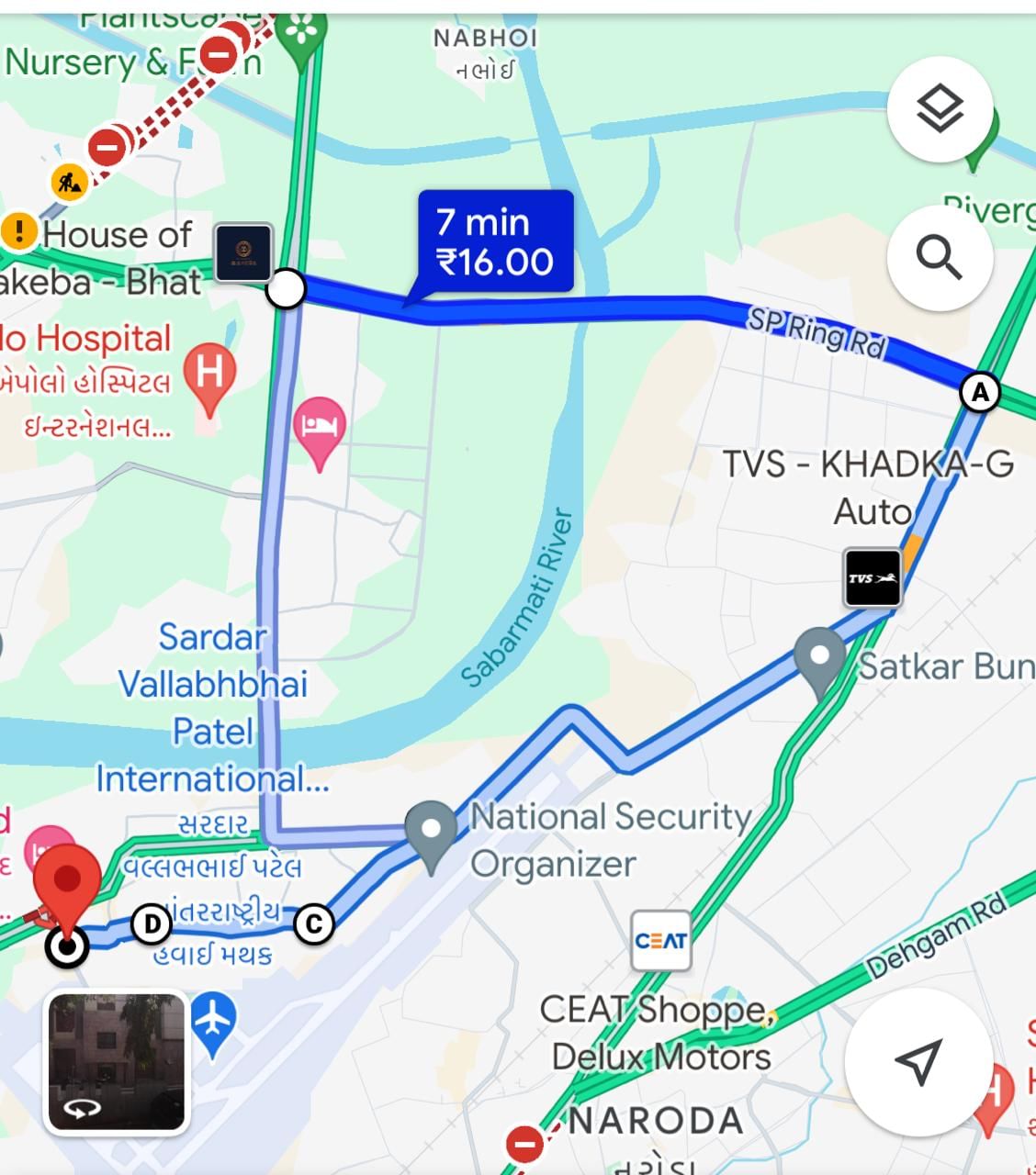 - કટમાંથી સરદાર નગર રોડ પર જઈ ઍરપોર્ટ પર પ્રીષ્ટીન હોટલ નજીકથી બહાર નીકળવું.
