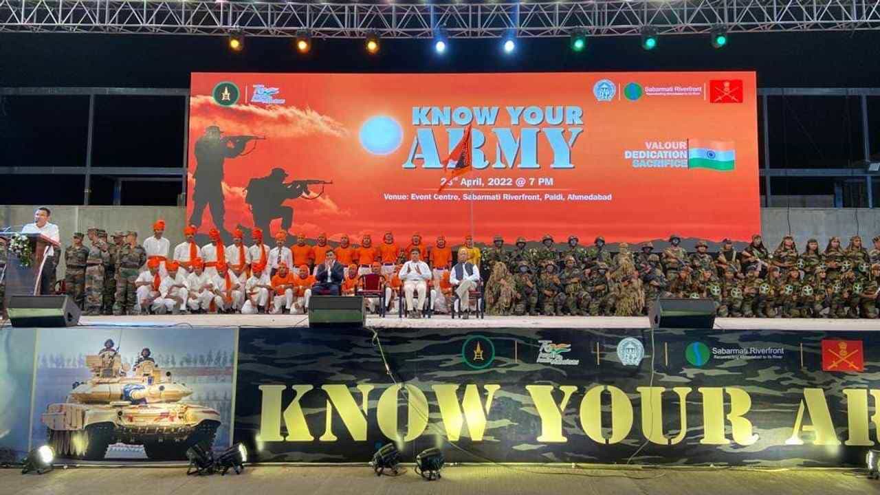 અમદાવાદમાં (Ahmedabad) સાબરમતી રિવર ફ્રન્ટની (River front) નજીક આવેલા ઈવેન્ટ સેન્ટર ખાતે ‘તમારા સૈન્યને જાણો’ અભિયાનનું આયોજન કરવામાં આવ્યું હતું. આર્મીમાં વધુમાં વધુ યુવાનો જોડાય તેમજ સરહદ પર વપરાતા આધુનિક હથિયાર અને સાધનો વિશે તેઓ માહિતગાર થાય તે ઉદ્દેશ સાથે સાબરમતી રિવરફ્રન્ટ પર આ કાર્યક્રમ યોજવામાં આવ્યો. કોણાર્ક કોર દ્વારા ગોલ્ડન કટાર ડિવિઝન અને નાગરિક પ્રશાસન સાથે મળીને આ આયોજન કરવામાં આવ્યુ. સામાન્ય લોકોમાં અને ખાસ કરીને યુવાનોમાં ‘સૈન્ય શૈલીમાં જીવન’ અંગે જાગૃતિ ફેલાવવા માટે આ અભિયાન યોજવામાં આવ્યું હતું.