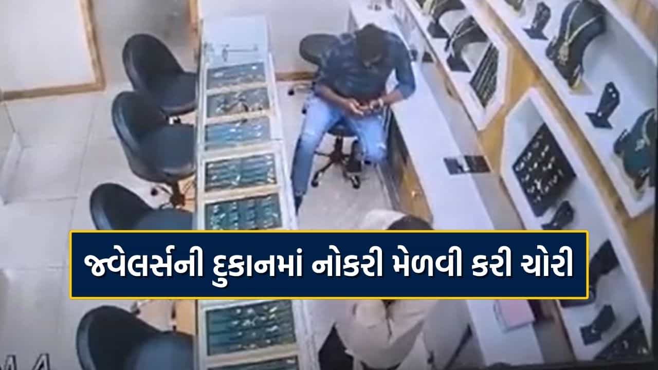 અમદાવાદના એક જવેલર્સ શોપમાં એક યુવક ચોરી કરવાના આયોજન સાથે નોકરીએ લાગ્યો. 4 કલાક માં જ તેનો ઈરાદો પાર પાડી દીધો. નિયમ મુજબ શોપમાં સ્ટોકની ગણતરી કરી અને cctv ની ચકાસણી કરી તો યુવકની કારતૂત નો ભાંડો ફુટ્યો અને પોલીસે ચોરી કરનાર અને ચોરીના દાગીના લઈ જનારની ધરપકડ કરી.