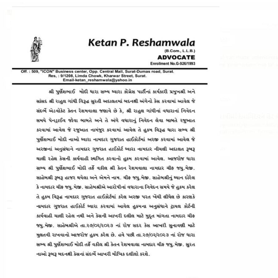 તેમણે સત્તા વાર રીતે પોતાના લેટરહેડ પર જણાવ્યું હતું કે હુકમ વિરૂદ્ધ નામદાર ગુજરાત હાઇકોર્ટમાં કરેલ અરજી પરત ખેંચી લીધેલ છે. કારણ કે ગુજરાત હાઇકોર્ટ દ્વારા કરવામાં આવેલા હુકમ અનુસંધાને ટ્રાયલ કોર્ટની કાર્યવાહી ચાલી રહેલ નથી. અને કેસની આખરી દલીલ માટે મુદત માંગતા હવે પછી તારીખ 27-02-23ના રોજ ધારાસભ્ય પૂર્ણેશભાઈ મોદી તર્ફે વકીલ કેતન રેશમાવાલા બદનક્ષીના કેસમાં રૂબરૂ દલીલ કરશે.