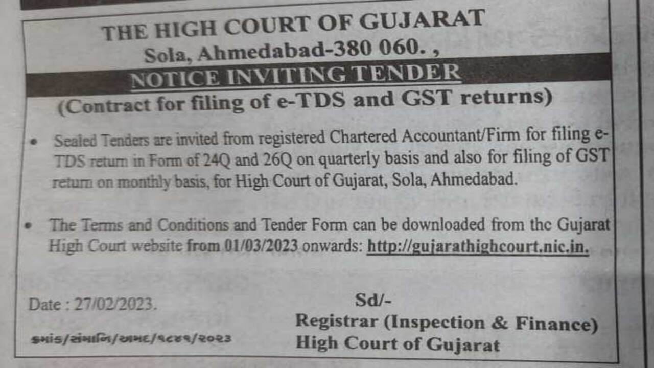 ગુજરાત હાઇકોર્ટ (Gujarat High Court) દ્વારા e-TDS અને GST ફાઇલ કરવાના કામ માટે નોંધણી કરાયેલા હોય તેવા ચાર્ટડ અકાઉન્ટન્ટ અથવા સંસ્થા પાસેથી સીલ કરાયેલા ટેન્ડર મગાવવામાં આવ્યા છે.