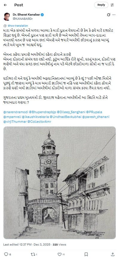 અમરેલી ભાજપના નેતા ભરત કાનાબાર અવારનવર તેમના નિવેદનો અને પોસ્ટને લઈને ચર્ચામાં આવતા રહે છે. આ વખતે તેમણે સોશિયલ મીડિયા X પર કરેલી પોસ્ટે ભારે ચર્ચા જગાવી છે. ભરત કાનાબારે જણાવ્યુ કે અમરેલીમાં રહેતા યુવકોને કોઈ દીકરી નથી આપતુ અને તેમના લગ્ન નથી થતા. અમરેલીનું નામ પડતા જ સંબંધમાં વાત આગળ ચાલતી નથી. ડૉ કાનાબારે જણાવ્યુ કે આ માત્ર કોઈ એક સમાજની નહીં પરંતુ દરેક જ્ઞાતિઓની આ જ વ્યથા છે.