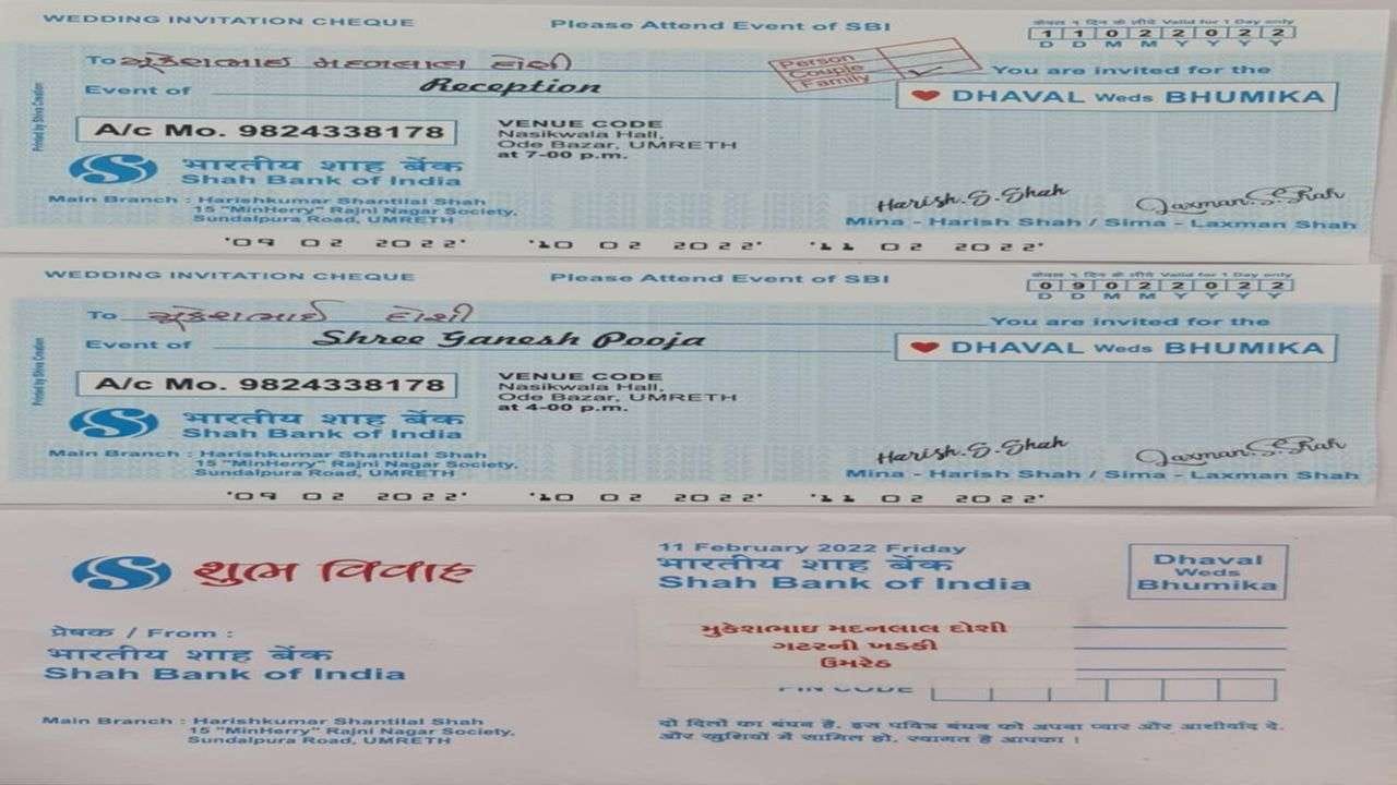 ઉમરેઠના એક શાહ પરિવાર દ્વારા ચેકમાં કાર્યક્રમની વિગતો અને પાસબૂકમાં વિશિષ્ટ પ્રકારની કંકોત્રી છપાવી છે.