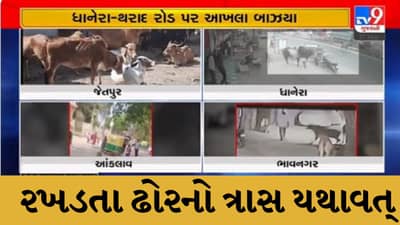 ગુજરાતમાં આખલાના આતંકની ઘટનાઓ ચિંતાજનક હદે વધી રહી છે. અલગ અલગ સ્થળોએથી આખલા બાખડવાની અથવા તો કોઈ વ્યક્તિને રખડતા ઢોરે અડફેટે લેવાની ઘટનાઓ સામે આવી રહી છે. જેતપુર, ભાવનગર, આણંદ અને બનાસકાંઠામાં ઢોરના આતંકની અલગ અલગ ઘટનાઓ સામે આવી છે. રખડતા ઢોર અચાનક ભર બજારમાં આવીને આતંક મચાવતા હોય તેવા અલગ અલગ દ્રશ્યો પણ સામે આવ્યા છે.