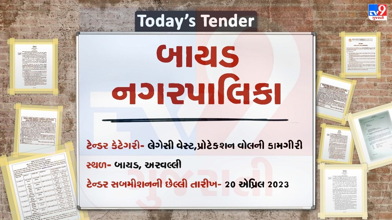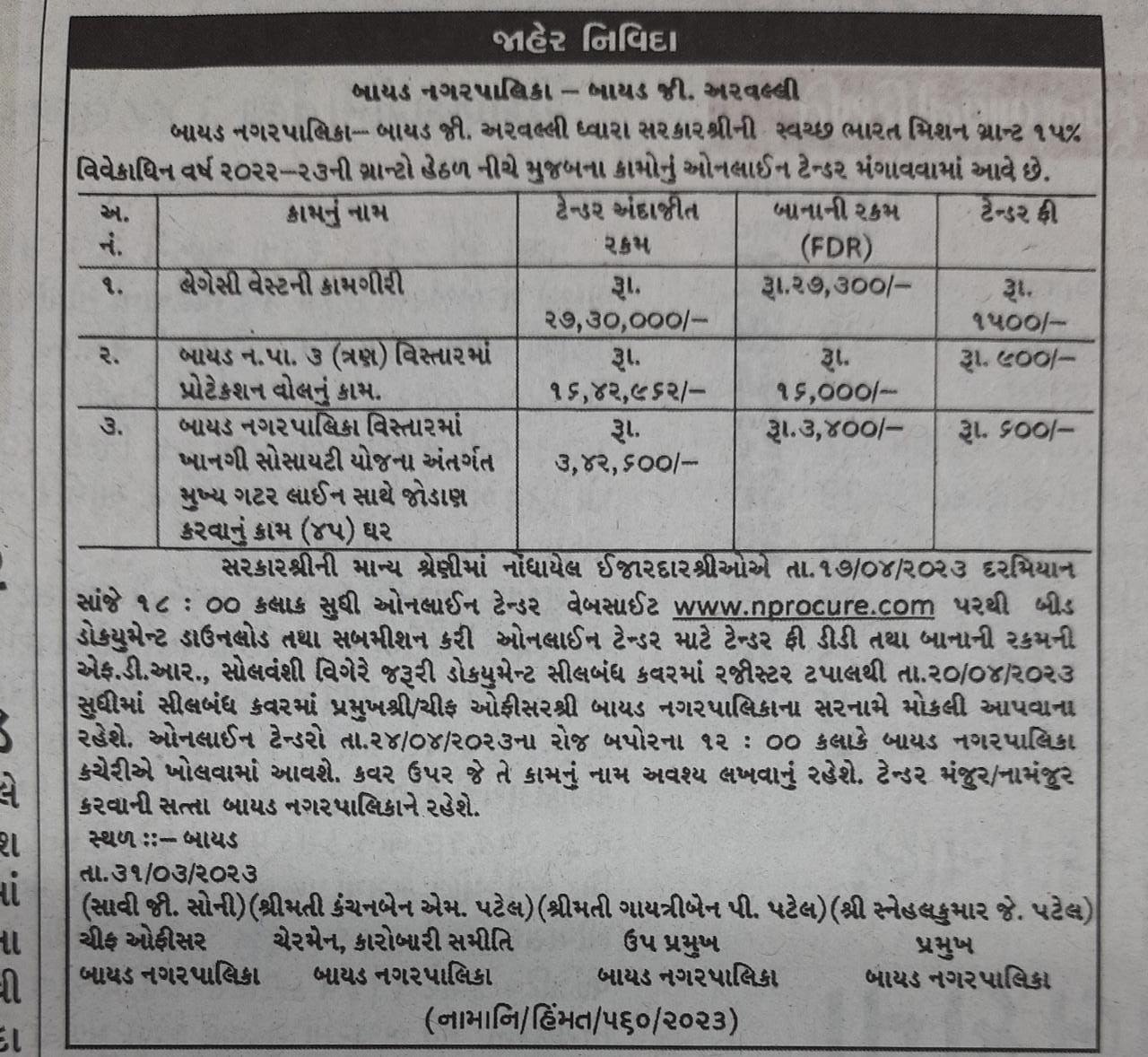 અરવલ્લી જિલ્લાની બાયડ નગરપાલિકા દ્વારા સરકારની સ્વચ્છ ભારત મિશન ગ્રાન્ટ 15 ટકા વિવેકાધિન વર્ષ 2022-23ની ગ્રાન્ટ હેઠળ ઓનલાઇન ટેન્ડર મગાવવામાં આવ્યુ છે. જુદા જુદા કામ માટે ટેન્ડર માટે ટેન્ડર જાહેર કરવામાં આવ્યુ છે. લેગેસી વેસ્ટની કામગીરી માટે 27,30,000 રુપિયાનું ટેન્ડર જાહેર કરાયુ છે. તેની બાનાની રકમ 27,300 રુપિયા છે. તો આ કામ માટે ટેન્ડરની ફી 1500 રુપિયા છે.