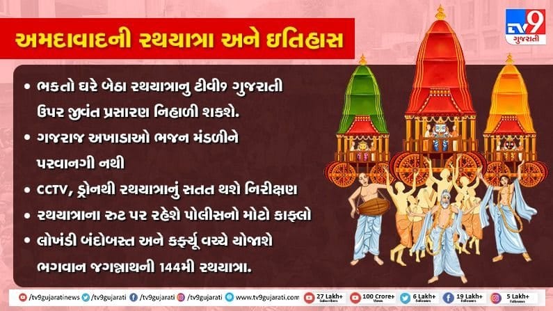 Jagannath Rath Yatra LIVE Streaming: અમદાવાદ(Ahmedabad) માં ભગવાન જગન્નાથજીની 144મી રથયાત્રા(Rathyatra) ને હવે ગણતરીના કલાક બાકી રહ્યા છે. ત્યારે લોકોમાં રથયાત્રાને કરફ્યુ અને પ્રોટોકોલ સાથે મંજૂરી આપવામાં આવી તે અંગે લોકોમાં જાગૃતિ લાવવા માટે અનેક વિસ્તારોમાં પ્રયાસ કરવામાં આવી રહ્યો છે.