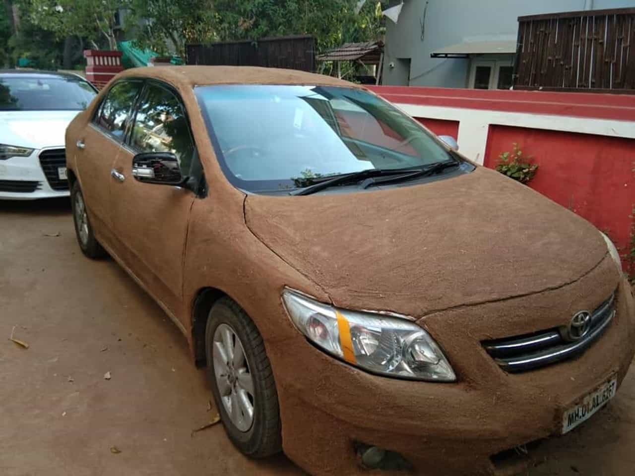 રૂપેશ ગૌરાંગ દાસે આ ફોટો અમદાવાદમાં 45 ડિગ્રી તાપમાનમાં પણ કેવી રીતે ઠંડક મળી શકે તે હેતુથી ક્લિક કર્યો છે જેમા 20 લાખની એક સેડાન કાર સંપૂર્ણ રીતે ગાયના છાણથી લીપેલી જોવા મળી રહી છે.
