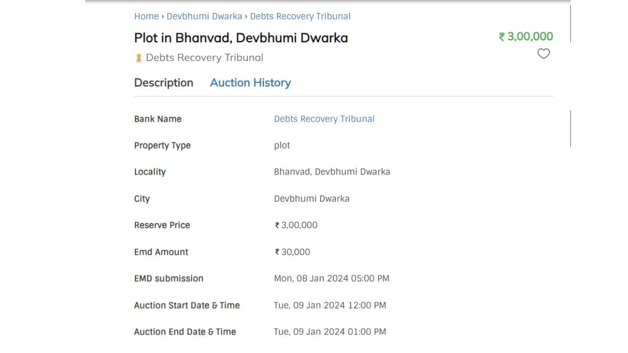 તેની રિઝર્વ કિંમત 3,00,000 રુપિયા રાખવામાં આવી છે. અર્નેસ્ટ મની ડિપોઝીટની રકમ 30,000 રુપિયા રાખવામાં આવી છે.અર્નેસ્ટ મની ડિપોઝીટ સબમીશનની તારીખ 8 જાન્યુઆરી 2024,સોમવારે સાંજે 5 કલાકની છે. ઇ-હરાજીની તારીખ 09 જાન્યુઆરી 2024,મંગળવારે બપોરે 12.00 કલાકથી બપોરે 1 કલાકની રાખવામાં આવી છે.