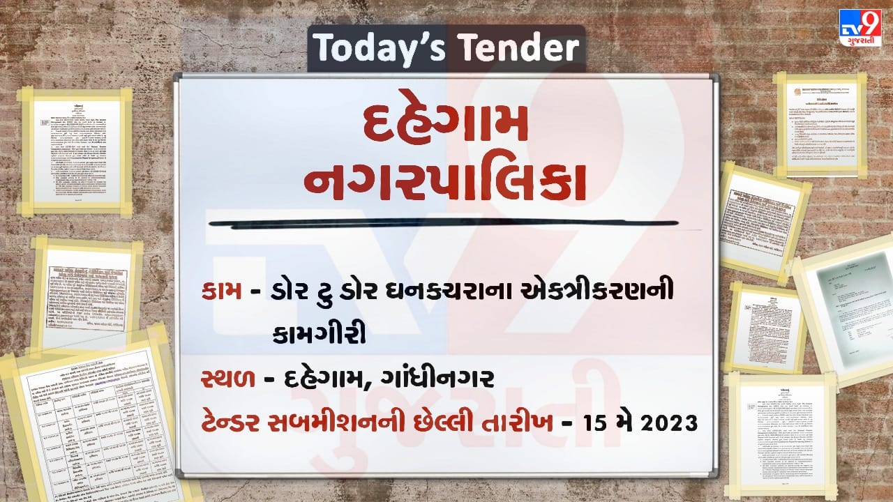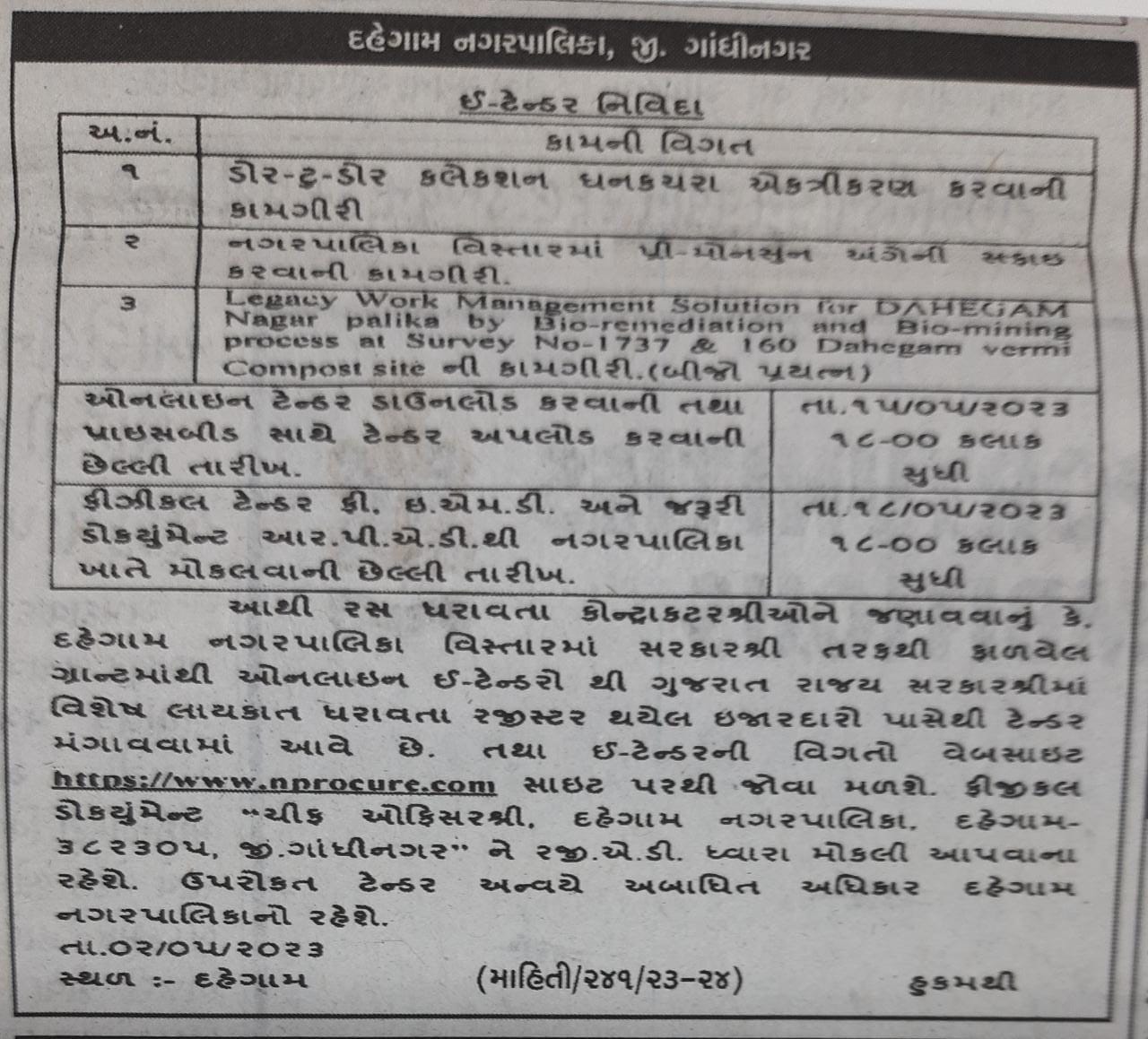 ગાંધીનગર જિલ્લામાં આવેલી દહેગામ નગરપાલિકા દ્વારા ડોર ટુ ડોર ઘનકચરાના એકત્રીકરણની કામગીરી માટે ટેન્ડર જાહેર કરવામાં આવ્યુ છે. નગરપાલિકા વિસ્તારમાં પ્રી-મોન્સૂન અંગેની સફાઇ કરવાની કામગીરી માટે પણ ટેન્ડર જાહેર કરવામાં આવ્યુ છે. આ કામમાં રસ ધરાવતા કોન્ટ્રાક્ટરોએ દહેગામ નગરપાલિકા વિસ્તારમાં સરકાર તરફથી ફાળવેલી ગ્રાન્ટમાંથી ઓનલાઇન ઇ-ટેન્ડથી ગુજરાત રાજ્ય સરકારમાં વિશેષ લાયકાત ધરાવતા રજીસ્ટર થયેલા ઇજારદારો પાસેથી ટેન્ડર મગાવવામાં આવ્યા છે.