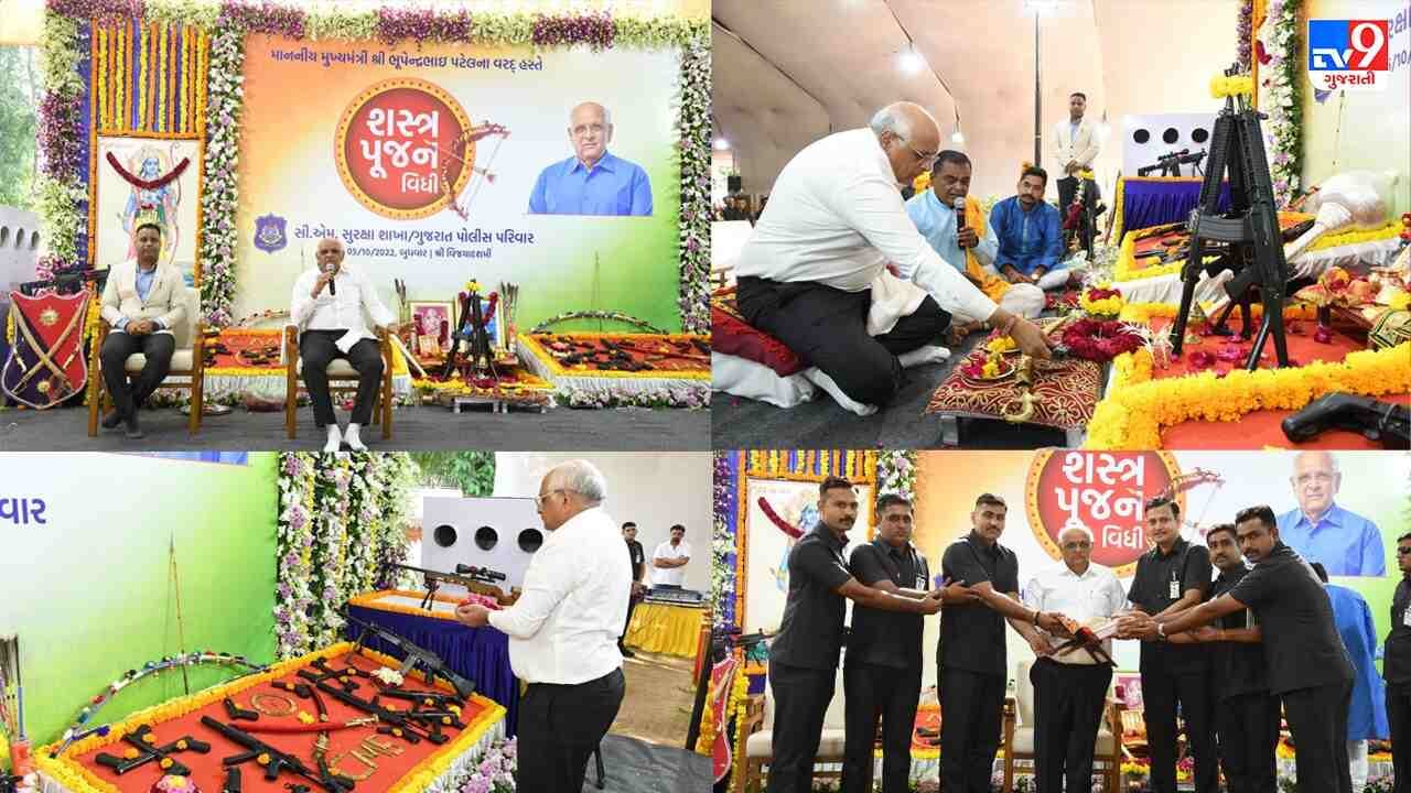 વિજયાદશમીના પાવન પર્વ નિમિત્તે મુખ્યપ્રધાન ભૂપેન્દ્ર પટેલે (CM Bhupendra Patel) ગાંધીનગરમાં તેમના નિવાસસ્થાને સુરક્ષા જવાનો સાથે મળીને શસ્ત્રોનું પૂજન કર્યું.