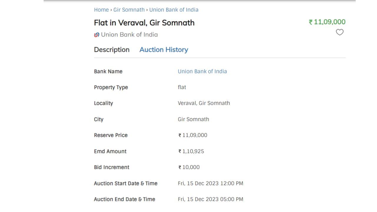 ગીર સોમનાથ: ગુજરાતના ગીર સોમનાથના વેરાવળમાં યુનિયન બેંક ઓફ ઇન્ડિયા દ્વારા બાકી લેણાંની વસૂલાત માટે સ્થાવર મિલકતની ઇ-હરાજીની જાહેરાત આપવામાં આવી છે. ગીર સોમનાથમાં આવેલી સ્થાવર મિલકત એટલે ફ્લેટના વેચાણ માટે આ જાહેરાત આપવામાં આવી છે.