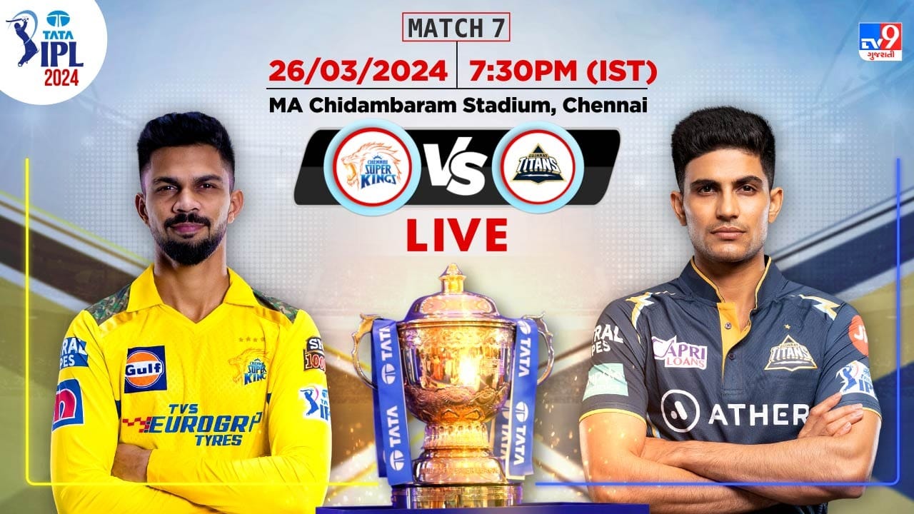 CSK vs GT Live Score IPL 2024 ની સાતમી મેચમાં મંગળવારે ચેન્નાઈ સુપર કિંગ્સ (CSK) અને ગુજરાત ટાઇટન્સ (GT) વચ્ચે ટક્કર થશે. ચેન્નાઈના એમએ ચિદમ્બરમ સ્ટેડિયમમાં બંને ટીમો આમને-સામને થશે. CSK અને GT ગયા વર્ષે ફાઇનલિસ્ટ હતા. ચેન્નાઈએ જીટીને હરાવીને તેનું પાંચમું ટાઈટલ જીત્યું. અત્યાર સુધી ચાલુ સિઝનમાં ઘરઆંગણે રમનારી ટીમો જીતી છે. શું આ ટ્રેન્ડ આજે પણ ચાલુ રહેશે, દરેકની નજર તેના પર હશે. ઉપરાંત, બે નવા કેપ્ટન ઋતુરાજ ગાયકવાડ અને શુભમન ગિલ, જેમણે પ્રથમ ‘ટેસ્ટ’ પાસ કરી હતી તેમની નેતૃત્વ કુશળતાની કસોટી કરવામાં આવશે. મહત્વનું છે કે ગુજરાત ટાઈટન્સને પણ નવા કેપ્ટન મળ્યા છે. હાર્દિક પંડ્યા એમઆઈમાં જોડાયા પછી ગીલને GTની કેપ્ટનશીપ મળી. માથાકૂટની વાત કરીએ તો ચેન્નાઈ અને ગુજરાત વચ્ચે કુલ પાંચ વખત ટક્કર થઈ છે. CMK બે મેચ રમી હતી જ્યારે GT એ ત્રણ મેચ રમી હતી.