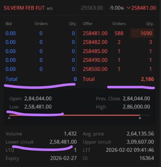 MCX પર સિલ્વર મિની ફેબ્રુઆરી મહિનાના ફ્યુચર્સ કોન્ટ્રેક્ટમાં 10% નીચી સર્કિટ લાગી છે. એક પણ ખરીદનાર નથી. બધા વેચાઈ રહ્યા છે.